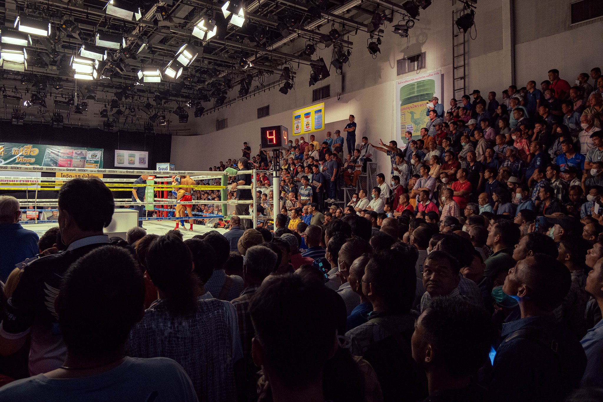 Almost nothing can describe the feeling of listening to the crowd chant 'ตี' (díi) as fighters exchange blows, the collective roar building with each strike. The air fills with whispers of wagers being placed, creating an electric environment. These photographs aim to document not only the athletic poetry of the fighters, but also the cultural theater that surrounds them.